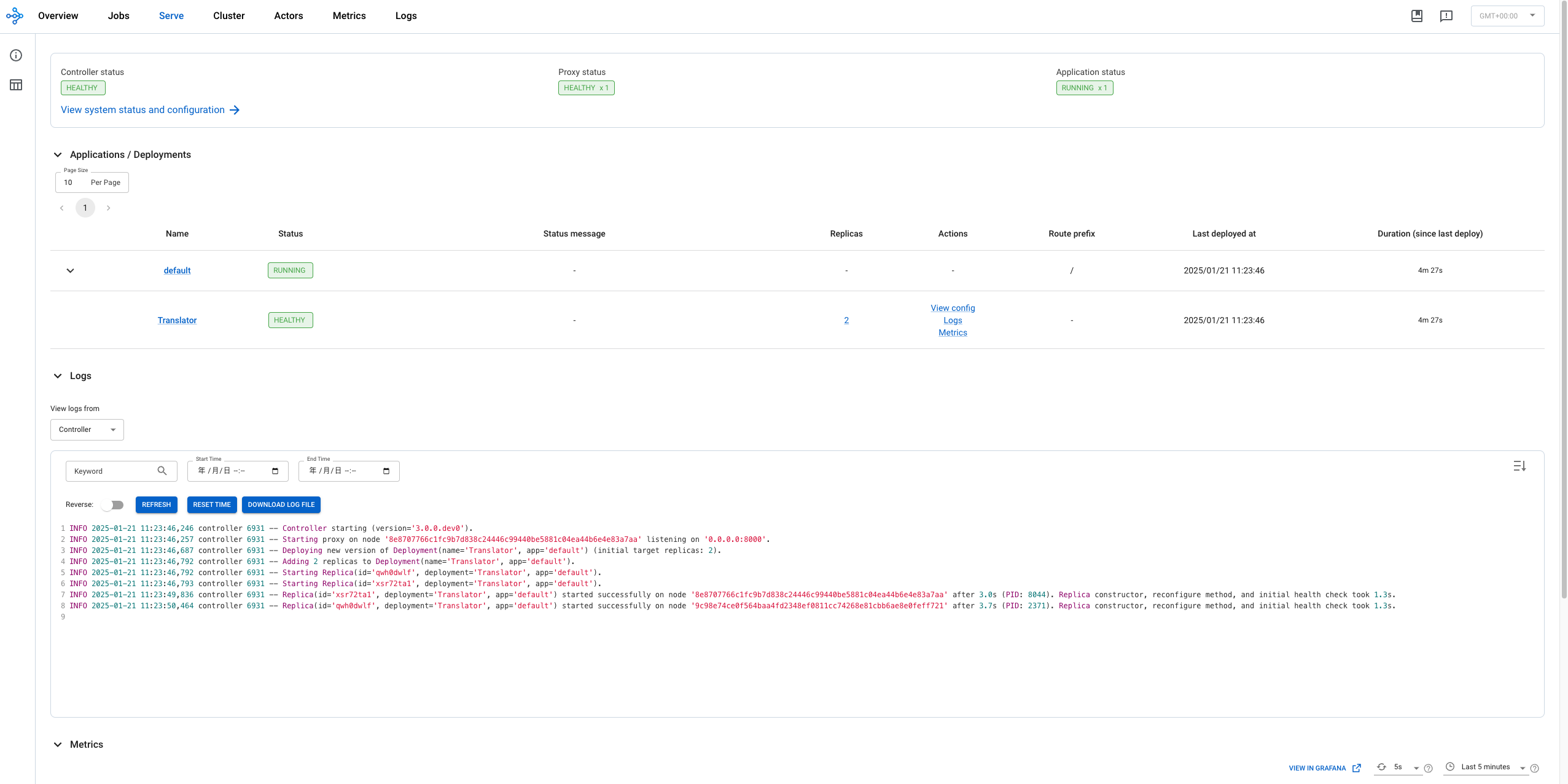 python translate.py ##2025-01-21 11:23:45,794 INFO worker.py:1654 -- Connecting to existing Ray cluster at address: 192.168.64.8:6379... ##2025-01-21 11:23:45,810 INFO worker.py:1832 -- Connected to Ray cluster. View the dashboard at 192.168.64.8:8265 ##INFO 2025-01-21 11:23:46,673 serve 8302 -- Started Serve in namespace "serve". ##INFO 2025-01-21 11:23:46,675 serve 8302 -- Connecting to existing Serve app in namespace "serve". New http options will not be applied. ##WARNING 2025-01-21 11:23:46,675 serve 8302 -- The new client HTTP config differs from the existing one in the following fields: ['host', 'location']. The new HTTP config is ignored. ##(ServeController pid=6931) INFO 2025-01-21 11:23:46,687 controller 6931 -- Deploying new version of Deployment(name='Translator', app='default') (initial target replicas: 2). ##(ProxyActor pid=8045) INFO 2025-01-21 11:23:46,644 proxy 192.168.64.8 -- Proxy starting on node 8e8707766c1fc9b7d838c24446c99440be5881c04ea44b6e4e83a7aa (HTTP port: 8000). ##(ProxyActor pid=8045) INFO 2025-01-21 11:23:46,660 proxy 192.168.64.8 -- Got updated endpoints: {}. ##(ProxyActor pid=8045) INFO 2025-01-21 11:23:46,690 proxy 192.168.64.8 -- Got updated endpoints: {Deployment(name='Translator', app='default'): EndpointInfo(route='/', app_is_cross_language=False)}. ##(ServeController pid=6931) INFO 2025-01-21 11:23:46,792 controller 6931 -- Adding 2 replicas to Deployment(name='Translator', app='default'). ##(ServeReplica:default:Translator pid=8044) Device set to use cpu ##INFO 2025-01-21 11:23:50,711 serve 8302 -- Application 'default' is ready at http://0.0.0.0:8000/. ##INFO 2025-01-21 11:23:50,711 serve 8302 -- Deployed app 'default' successfully. ##(ServeReplica:default:Translator pid=2371, ip=192.168.64.9) Device set to use cpu